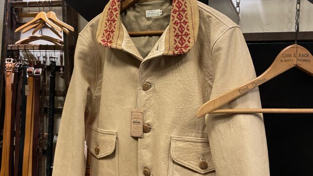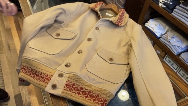 ウエアハウス直営店限定のラムレザージャケットはネイティブ柄のA1タイプ。しなやかで軽いラムレザーのジャケットは当時のライフスタイルに合うトラベルアイテムとして愛用されたヴィンテージを再現したものです。ストレスのない着心地に惹かれます。
